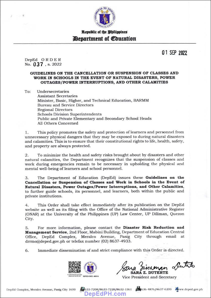 If you want to review the full text of DepEd Order 37 Series 2022 in PDF file, you can download it here – https://depedph.com/wp-content/uploads/2024/01/DepEd-Order-37-s.-2022-cancellation-of-classes-due-to-calamity-philippines-full-PDF-File.pdf