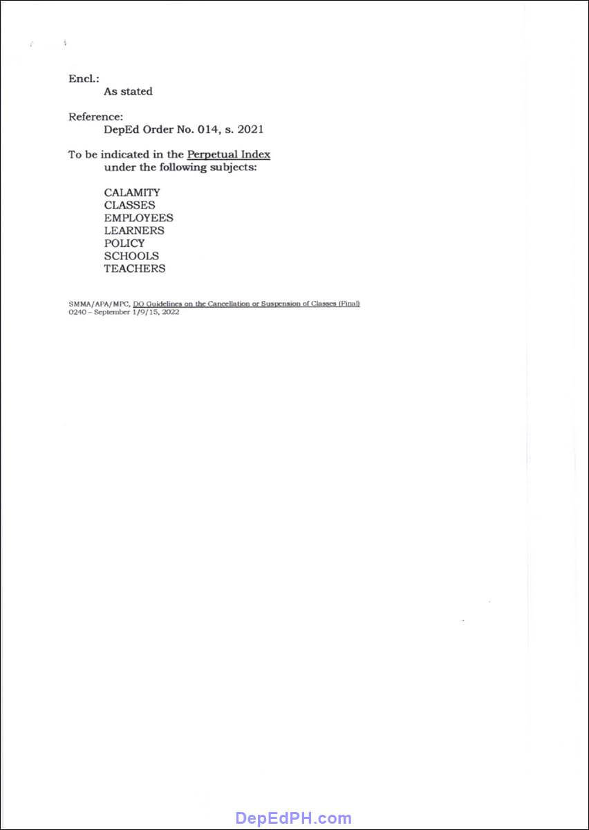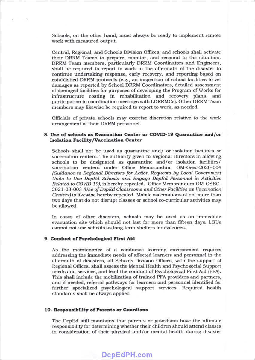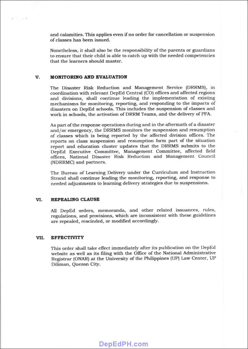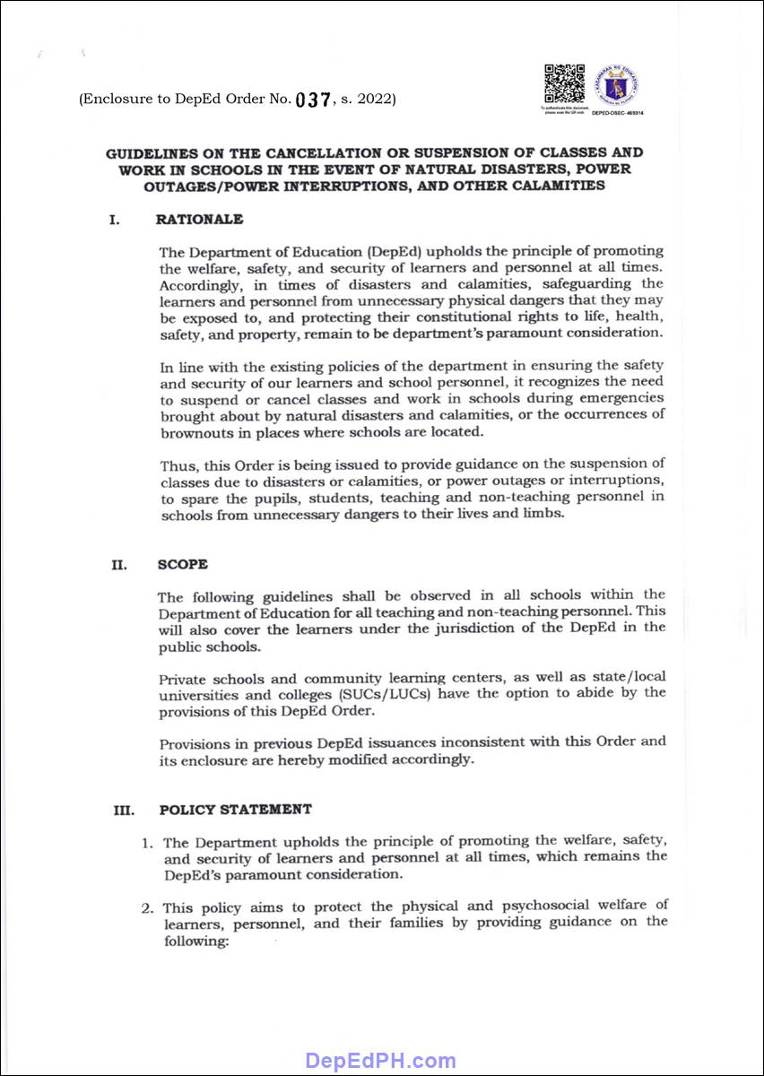- Provide guidance on class and work cancellation or suspension at school during disasters, calamities, or emergencies, which is imperative to preserve the physical and mental well-being of students, pupils, learners, and teaching and non-teaching personnel.