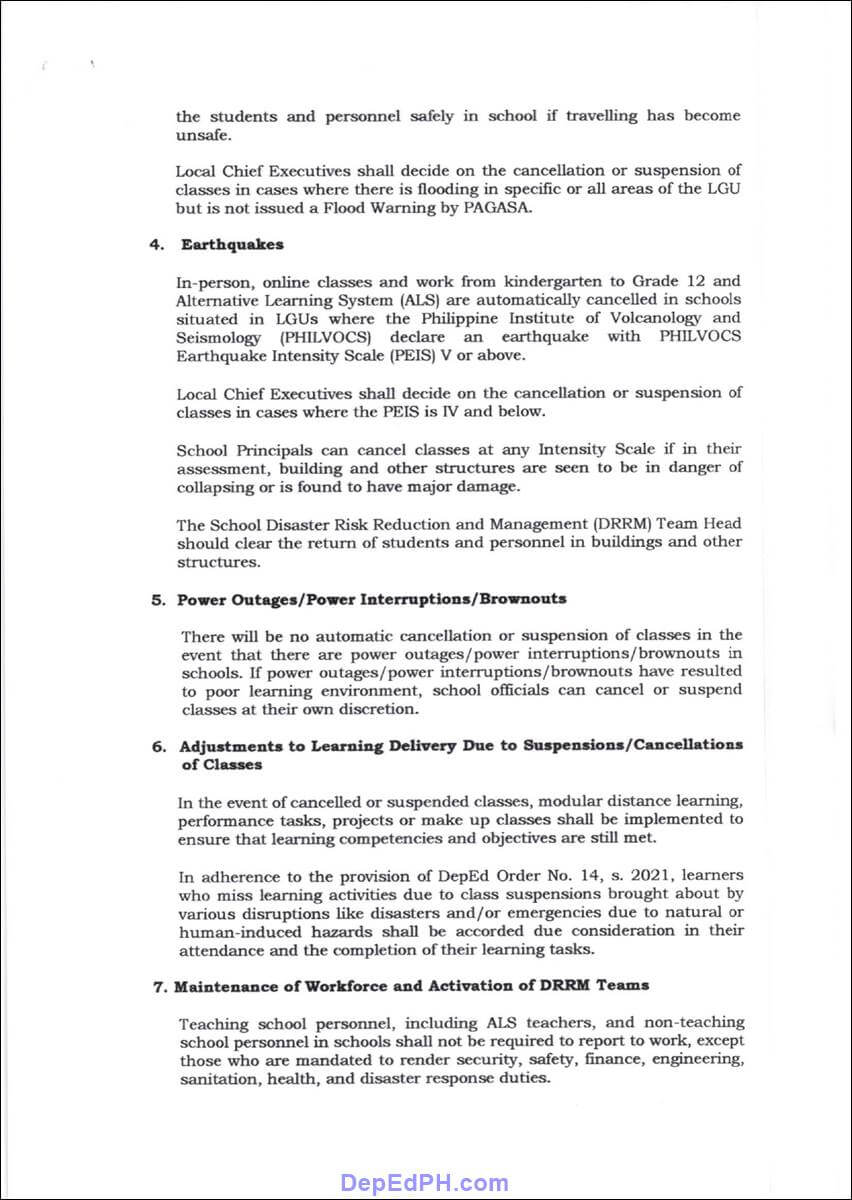 This policy contains detailed information on when to suspend or cancel classes in public and private schools in case of typhoons, heavy rainfall, floods, earthquakes, power outages/power interruptions, or brownouts. Moreover, the policy specified the decision-makers to achieve DepEd’s goal to protect students and teaching and non-teaching personnel from the dangers of disasters and natural calamities.