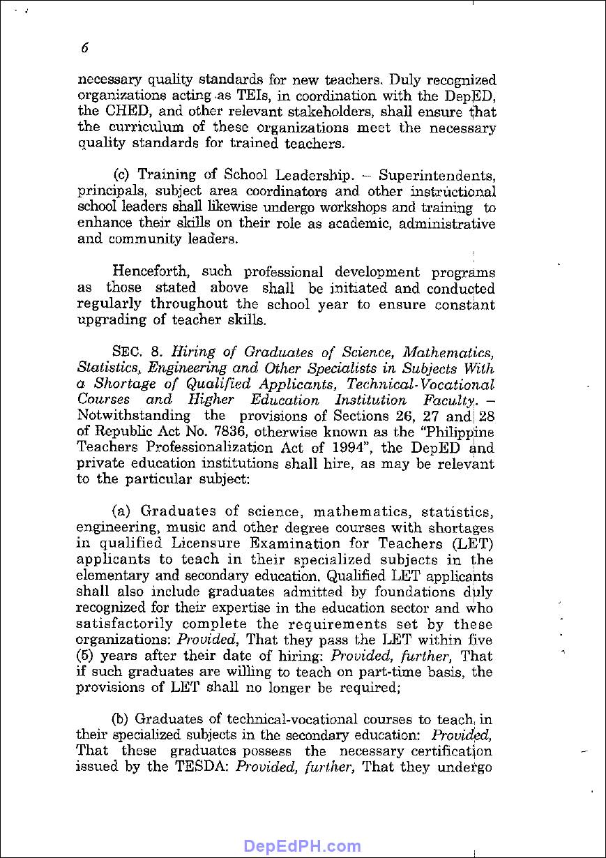 Meanwhile, DepEd and private educational institutions may hire other teachers required for a specific subject, such as graduates of music, science, engineering, mathematics, and other degree or technical-vocational courses and practitioners.