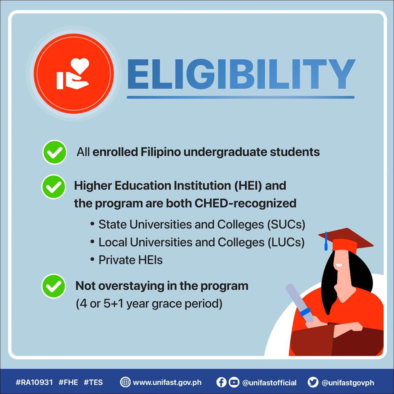 - Higher Education Institution (HEI) and the program are both CHED-recognized