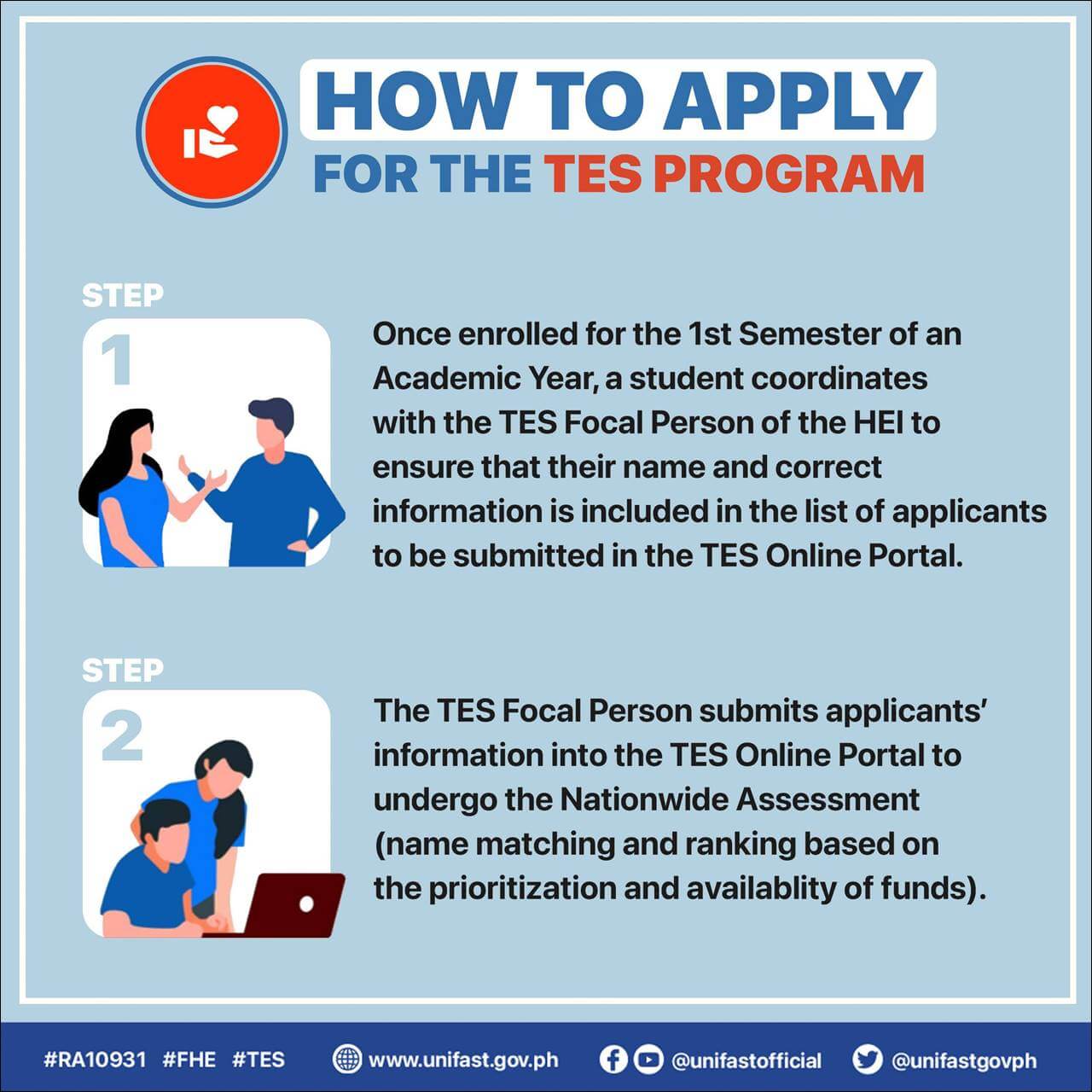 Step 2: Work with the HEI’s TES Focal Person after enrolling for the first semester of the academic year to make sure that your name and accurate information are included in the list of applicants that will be submitted through the TES Online Portal.